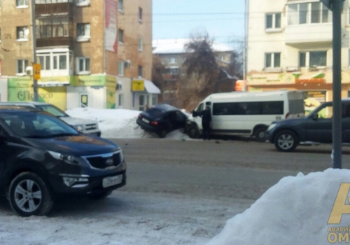 В районе кинотеатра «Галактика» микроавтобус въехал в легковой автомобиль неизвестной марки. Он лежит на сугробе – непонятно, авто отбросило из-за удара, или водитель попытался совершить непонятный маневр.