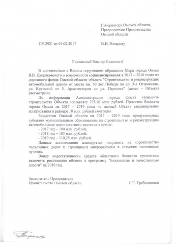 «Мэр Вячеслав Двораковский обращался к главе региона Виктору Назарову с просьбой на условиях софинансирования помочь городу в строительстве этой магистрали. Общая стоимость проекта составляет около 780 миллионов рублей: от области требовалось в 2017 году миллионов 150-200: вполне посильный вклад, с учетом того, что региональный дорожный фонд превышает семь миллиардов рублей. Однако Станислав Гребенщиков де факто заблокировал выделение средств городу, заставив министра строительства и жилищно-коммунального комплекса Бирюкова подготовить отрицательный ответ», – рассказал наш собеседник, знакомый с ситуацией.