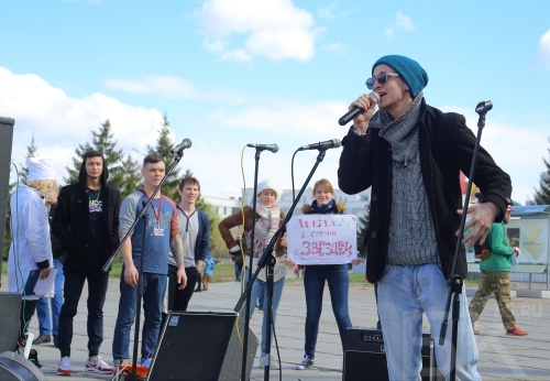 Участники пришли на Театральную площадь, чтобы, не опуская плакатов, насладиться концертом омских коллективов.