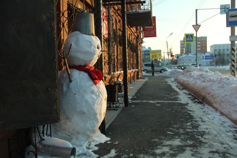 | На улице Орджоникидзе снеговик, словно привратник, приветствует прохожих. ФОТО: А.Катаев |