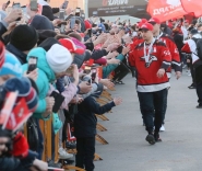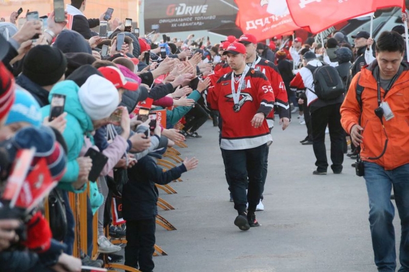| Дорожка почёта перед награждением "Авангарда" "серебром" чемпионата России и Кубком Восточной конференции накануне. Впереди колонны игроков - форвард Сергей Широков.