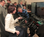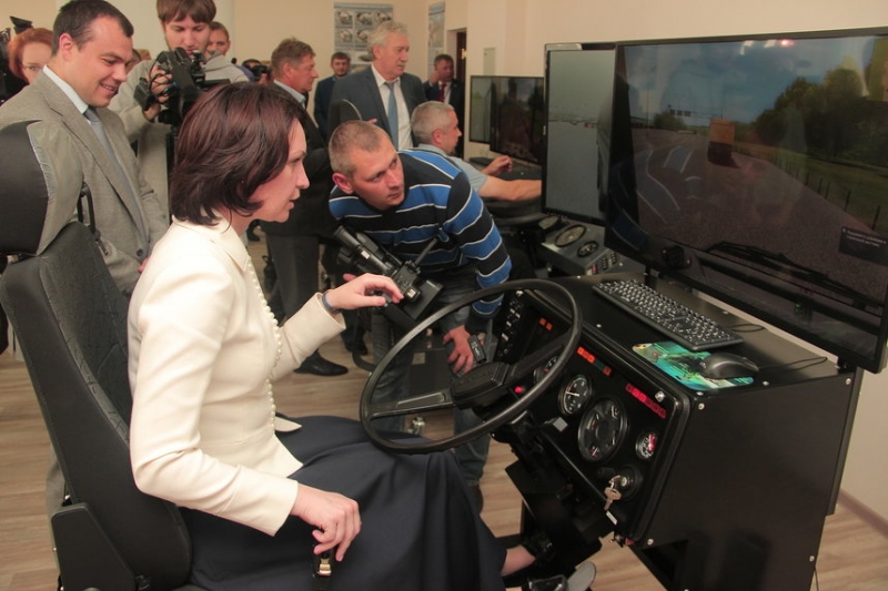 | Оксана Фадина - у руля! То тут, то там. Накануне вот мэр порулила КАМАЗом. Правда, пока только на тренажере, посетив Федеральный учебный центр в СибАДИ. Фото: А. Катаева |