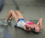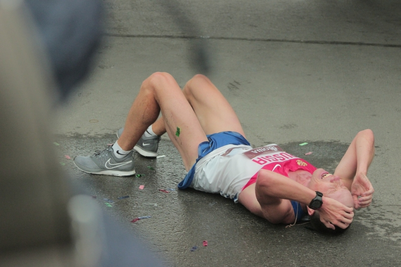 | Нелегкая победа!В Омске прошел 29-й международный Сибирский марафон. Титул действующего чемпиона защитил Андрей Лейман из Краснодара. Он преодолел дистанцию за 2 часа 17 минут 4 секунды, улучшив прошлогодний результат.После финиша он упал без сил,но, отдышавшись, поднялся, как ни в чем не бывало. Фото: А. Катаева |