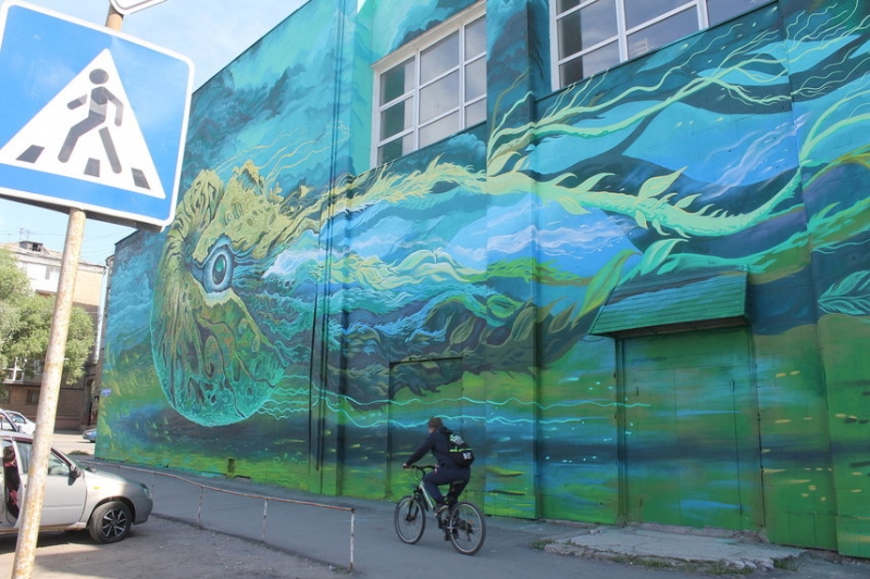 | "Стенографии " следы! В Омске издали видны... Яркие гигантские граффити украсили улицы города.На стене Дома культуры «Современник» по улице Ипподромная красуется гигантский наутилус. Его автор - художник Георгий Куринов из Красноярска.Площадь рисунка - 600 квадратных метров. Это пока самый огромный стрит-арт объект в Омске.Фото: Сергей Быховец |